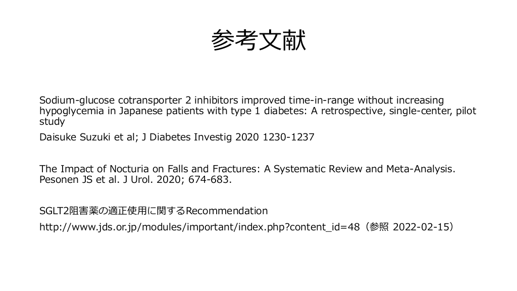 Q&A Q. 周術期のSGLT2内服は中止、再開の基準は? A. 周術期のストレスや絶食でケトアシドーシスリスクが上がります 手術前は3日前から休薬がすすめられています 再開は食事が十分に行えていることを確認して再開しましょう Q. 高齢者でおむつの患者は避けた方がよい? A. 個人的には避けています 陰部を清潔に保てず尿路感染症を引き起こすリスクになります 心不全や慢性腎臓病の場合でも使用するときは注意を! #24. 参考文献 Sodium-glucose cotransporter 2 inhibitors improved time-in-range without increasing hypoglycemia in Japanese patients with type 1 diabetes: A retrospective, single-center, pilot study Daisuke Suzuki et al; J Diabetes Investig 2020 1230-1237 The Impact of Nocturia on Falls and Fractures: A Systematic Review and Meta-Analysis. Pesonen JS et al. J Urol. 2020; 674-683. SGLT2阻害薬の適正使用に関するRecommendation http://www.jds.or.jp/modules/important/index.php?content_id=48(参照 2022-02-15)