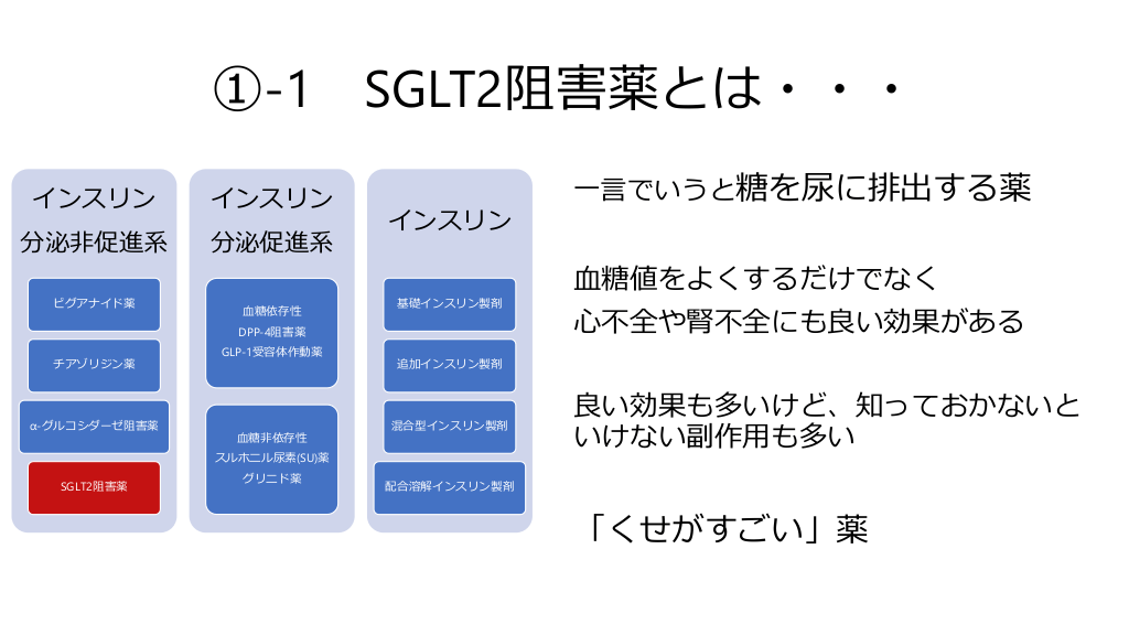 ①-1 SGLT2阻害薬とは・・・ インスリン インスリン 分泌非促進系 分泌促進系 ビグアナイド薬 血糖依存性 インスリン 基礎インスリン製剤 DPP-4阻害薬 チアゾリジン薬 α-グルコシダーゼ阻害薬 GLP-1受容体作動薬 血糖非依存性 グリニド薬 血糖値をよくするだけでなく 心不全や腎不全にも良い効果がある 追加インスリン製剤 混合型インスリン製剤 スルホニル尿素(SU)薬 SGLT2阻害薬 一言でいうと糖を尿に排出する薬 良い効果も多いけど、知っておかないと いけない副作用も多い 配合溶解インスリン製剤 「くせがすごい」薬 #5.
