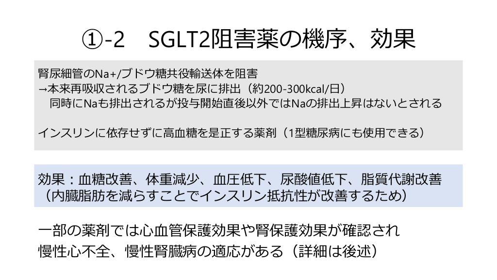 ①-2 SGLT2阻害薬の機序、効果 腎尿細管のNa+/ブドウ糖共役輸送体を阻害 →本来再吸収されるブドウ糖を尿に排出(約200-300kcal/日) 同時にNaも排出されるが投与開始直後以外ではNaの排出上昇はないとされる インスリンに依存せずに高血糖を是正する薬剤(1型糖尿病にも使用できる) 効果:血糖改善、体重減少、血圧低下、尿酸値低下、脂質代謝改善 (内臓脂肪を減らすことでインスリン抵抗性が改善するため) 一部の薬剤では心血管保護効果や腎保護効果が確認され 慢性心不全、慢性腎臓病の適応がある(詳細は後述) 1型糖尿病におけるSGLT2阻害薬の使用 #7.