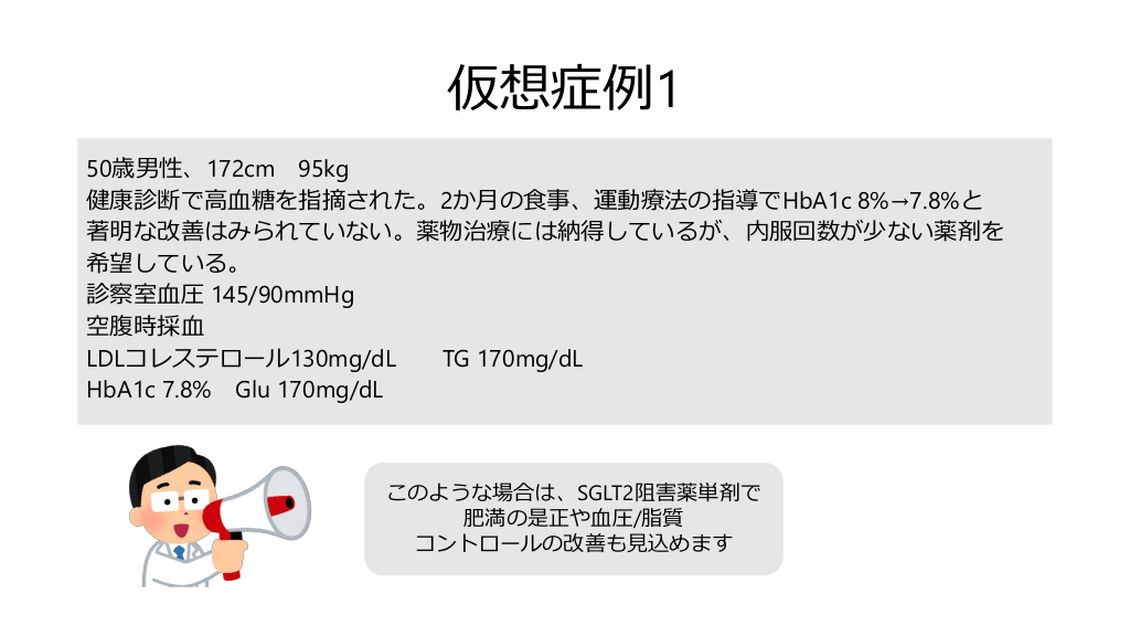 仮想症例1 50歳男性、172cm 95kg 健康診断で高血糖を指摘された。2か月の食事、運動療法の指導でHbA1c 8%→7.8%と 著明な改善はみられていない。薬物治療には納得しているが、内服回数が少ない薬剤を 希望している。 診察室血圧 145/90mmHg 空腹時採血 LDLコレステロール130mg/dL TG 170mg/dL HbA1c 7.8% Glu 170mg/dL このような場合は、SGLT2阻害薬単剤で 肥満の是正や血圧/脂質 コントロールの改善も見込めます #8.