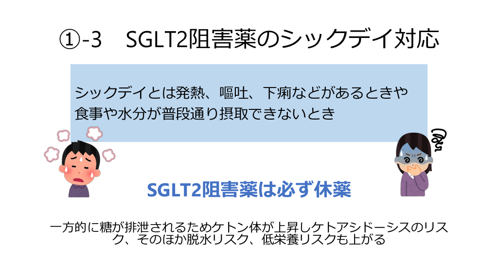 ①-3 SGLT2阻害薬のシックデイ対応 シックデイとは発熱、嘔吐、下痢などがあるときや 食事や水分が普段通り摂取できないとき SGLT2阻害薬は必ず休薬 一方的に糖が排泄されるためケトン体が上昇しケトアシドーシスのリス ク、そのほか脱水リスク、低栄養リスクも上がる #9.