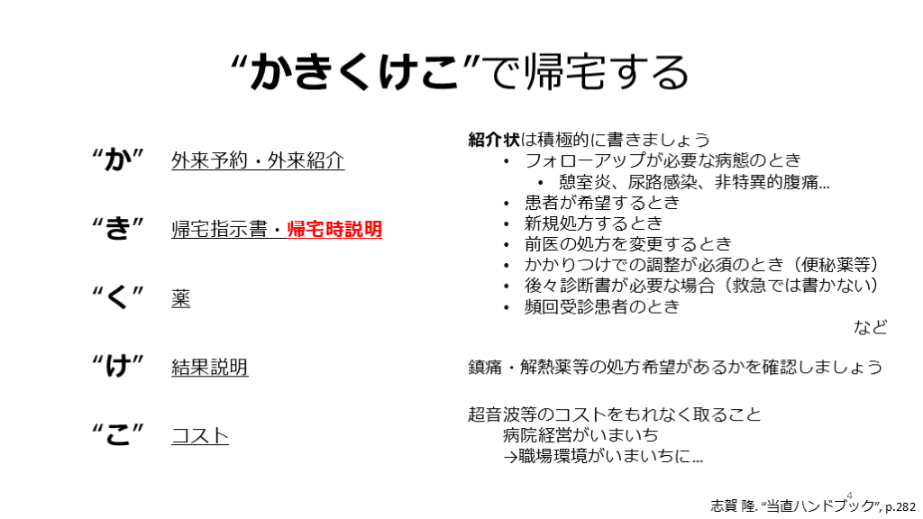 #4. “か” “く” “き” “け” “こ” 外来予約・外来紹介 帰宅指示書・帰宅時説明 薬 結果説明 コスト 紹介状は積極的に書きましょう