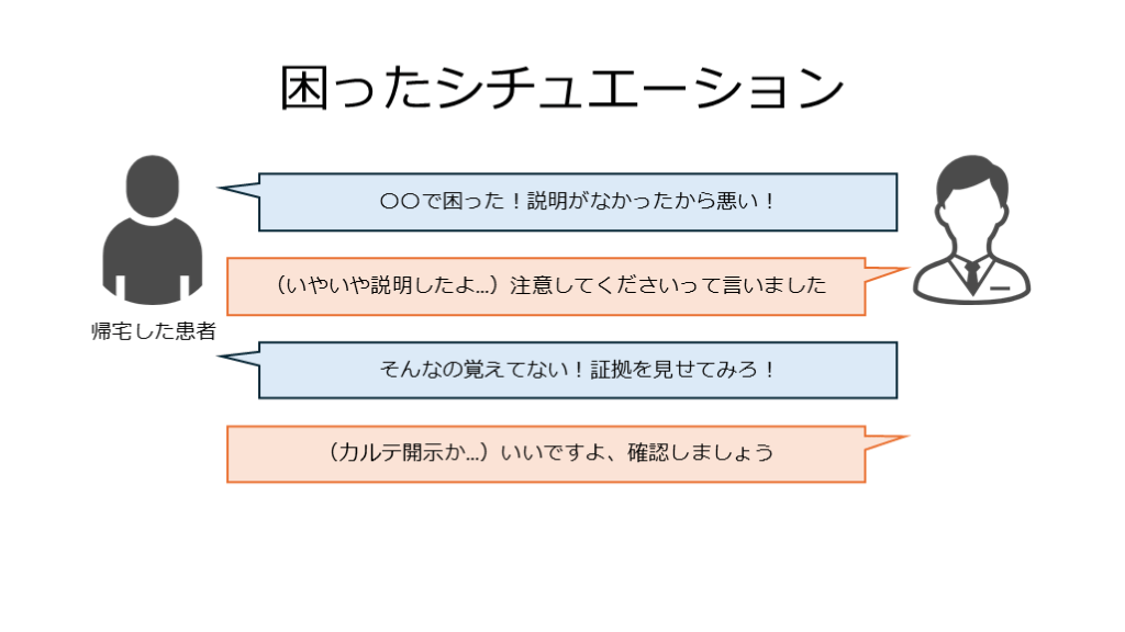 #5. 困ったシチュエーション 〇〇で困った!説明がなかったから悪い! 帰宅した患者 (いやいや説明したよ…)注意してくださいって言いました そんなの覚えてない!証拠を見せてみろ! (カルテ開示か…)いいですよ、確認しましょう