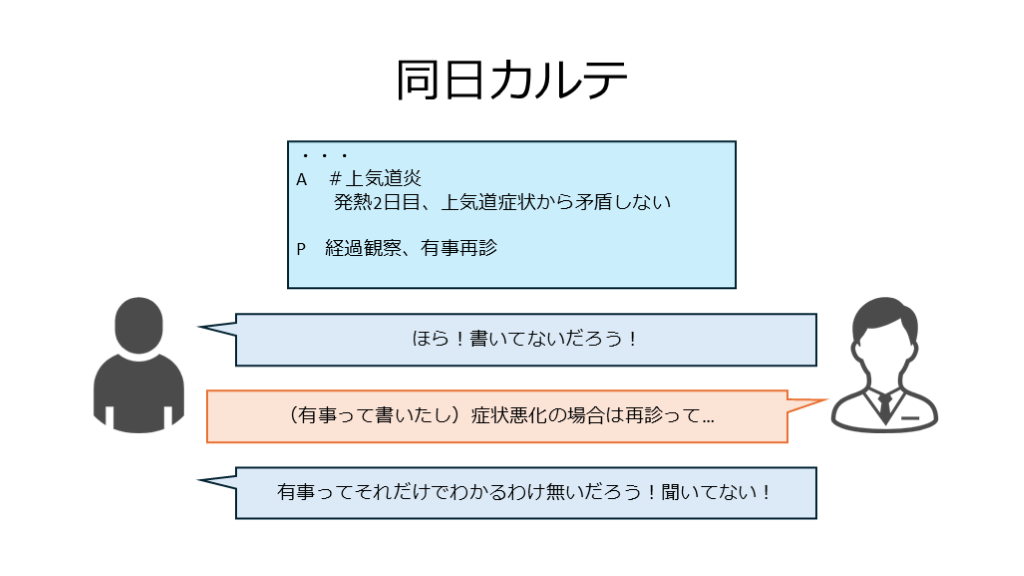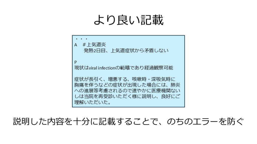 胸痛を伴うなどの症状が出現した場合には、肺炎への進展等考慮されるので速やかに医療機関ないしは当院を再受診いただく様に説明し、良好にご理解いただいた。 説明した内容を十分に記載することで、のちのエラーを防ぐ