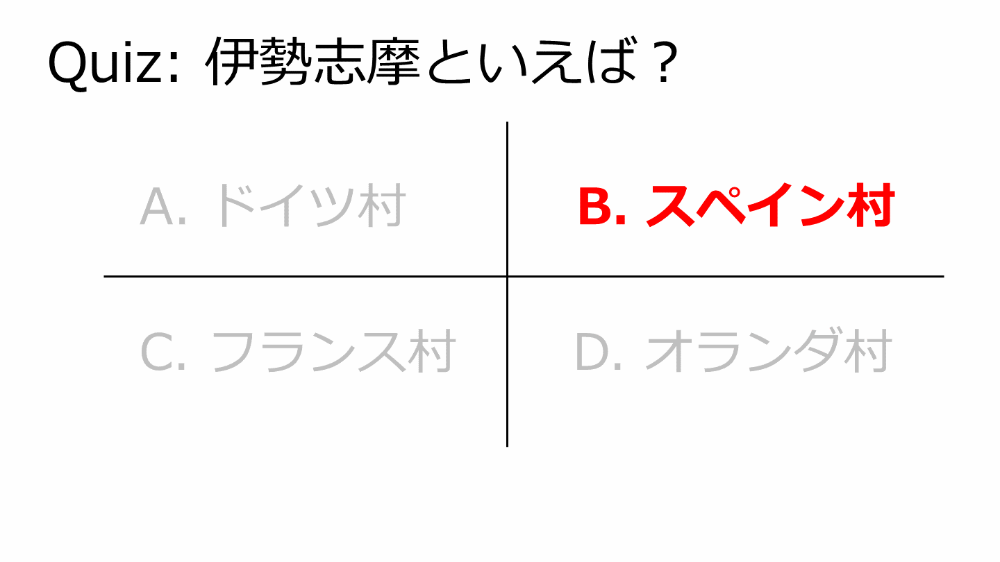 #4. Quiz: 伊勢志摩といえば? A. ドイツ村 D. オランダ村 C. フランス村 B. スペイン村
