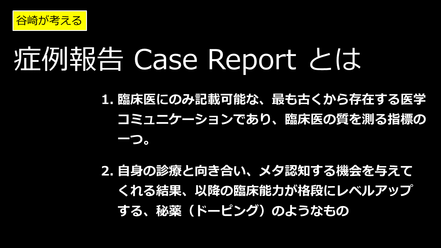 #7. 症例報告 Case Report とは 臨床医にのみ記載可能な、最も古くから存在する医学コミュニケーションであり、臨床医の質を測る指標の一つ。 自身の診療と向き合い、メタ認知する機会を与えてくれる結果、以降の臨床能力が格段にレベルアップする、秘薬(ドーピング)のようなもの