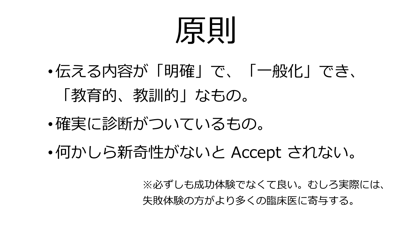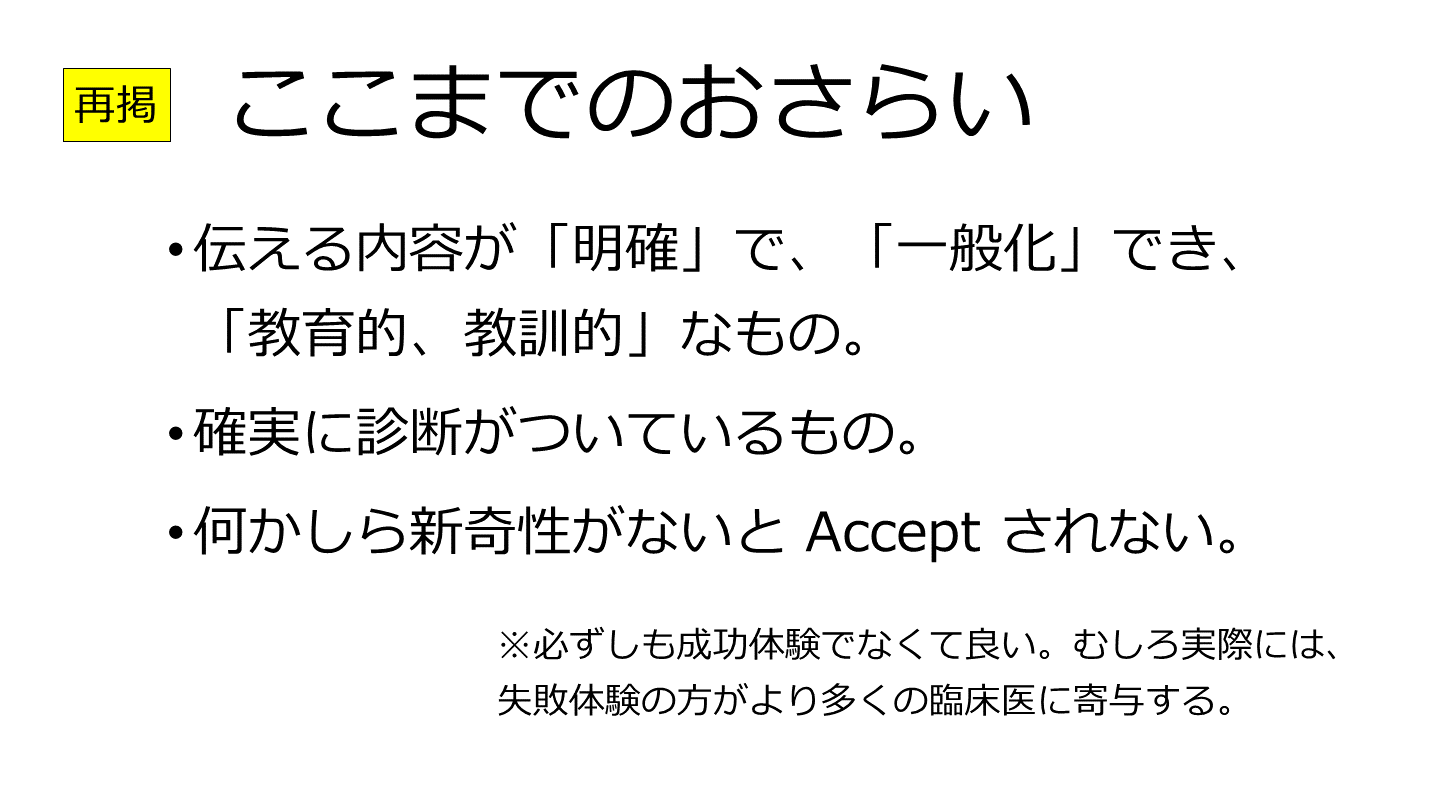 何かしら新奇性がないと Accept されない。 ※必ずしも成功体験でなくて良い。むしろ実際には、失敗体験の方がより多くの臨床医に寄与する。