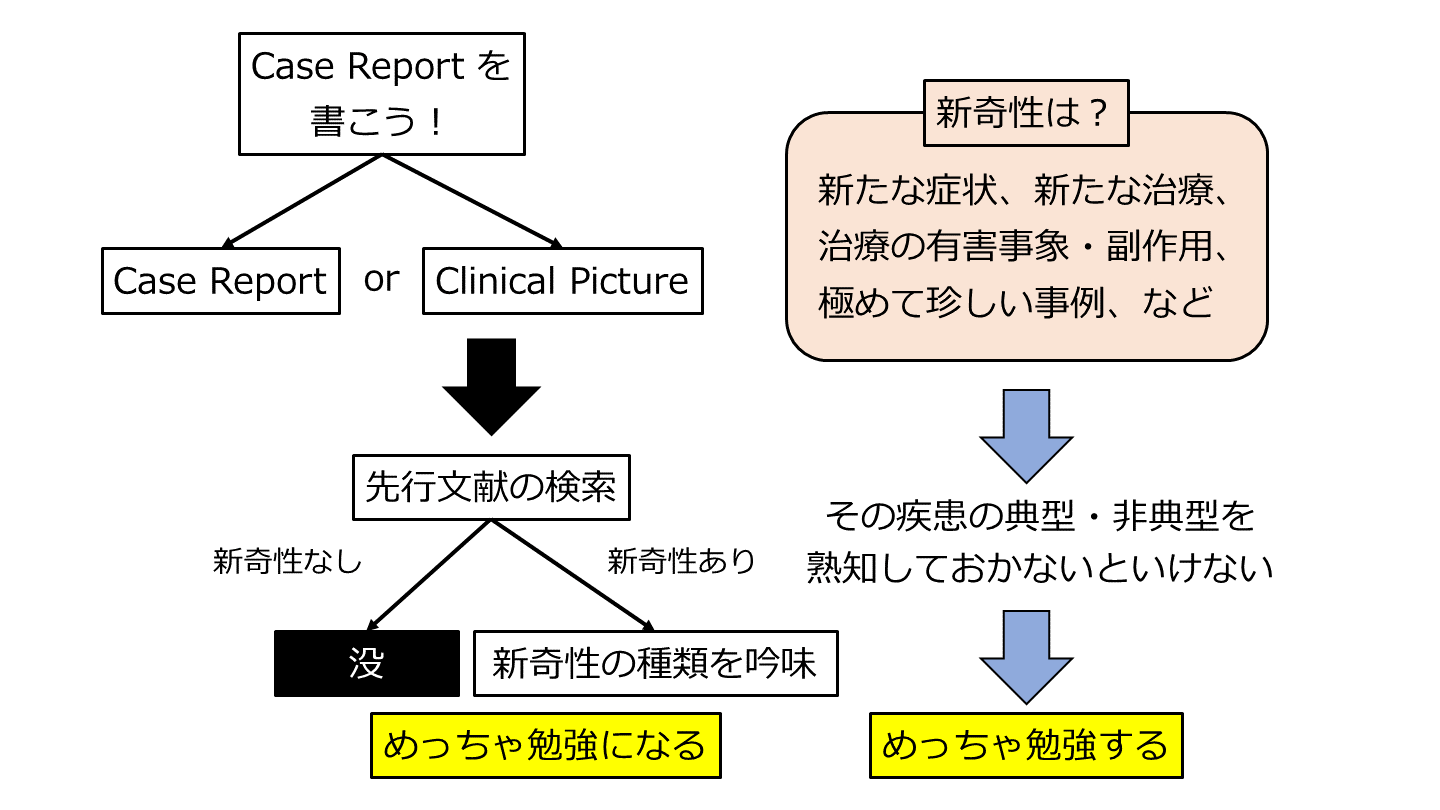 何かしら新奇性がないと Accept されない。 ※必ずしも成功体験でなくて良い。むしろ実際には、失敗体験の方がより多くの臨床医に寄与する。 ここまでのおさらい 再掲