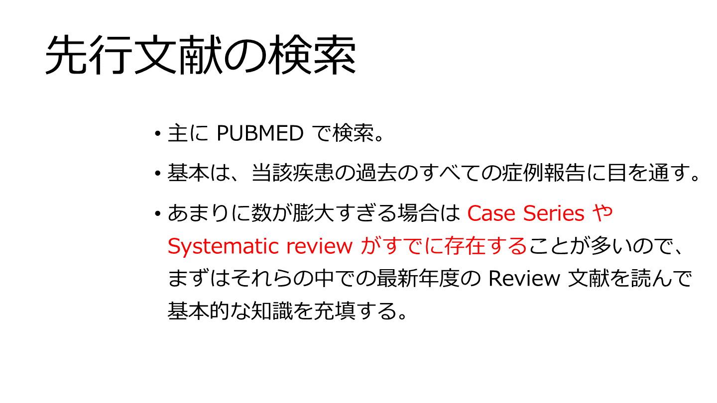 基本は、当該疾患の過去のすべての症例報告に目を通す。