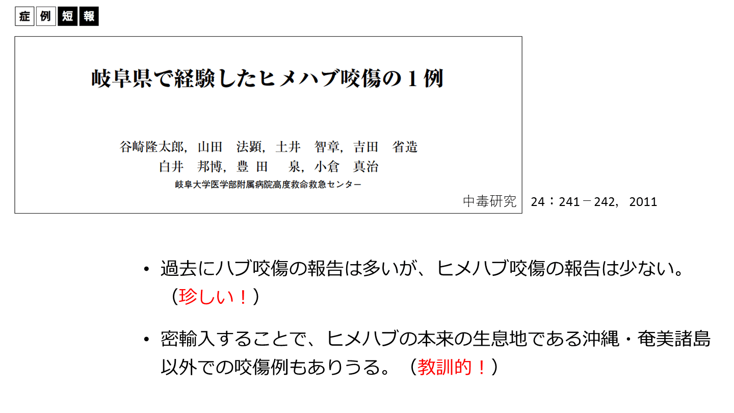 #16. 中毒研究 24:241-242,2011 過去にハブ咬傷の報告は多いが、ヒメハブ咬傷の報告は少ない。(珍しい!) 密輸入することで、ヒメハブの本来の生息地である沖縄・奄美諸島以外での咬傷例もありうる。(教訓的!)