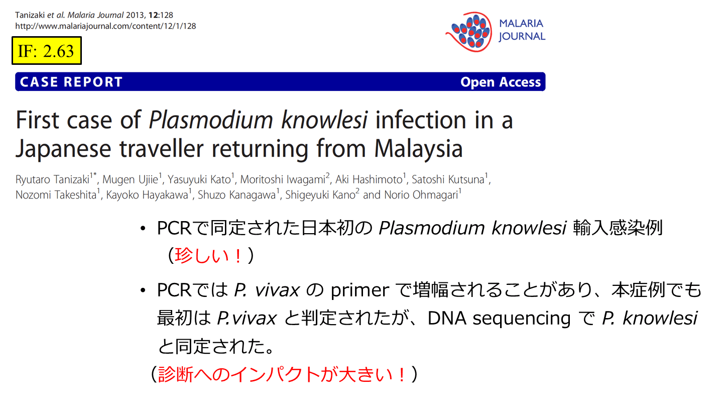 #17. PCRで同定された日本初の Plasmodium knowlesi 輸入感染例(珍しい!) PCRでは P. vivax の primer で増幅されることがあり、本症例でも最初は P.vivax と判定されたが、DNA sequencing で P. knowlesi と同定された。
