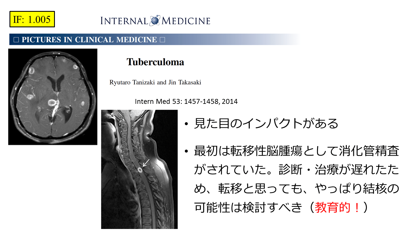 #18. 見た目のインパクトがある 最初は転移性脳腫瘍として消化管精査がされていた。診断・治療が遅れたため、転移と思っても、やっぱり結核の可能性は検討すべき(教育的!) Intern Med 53: 1457-1458, 2014 IF: 1.005