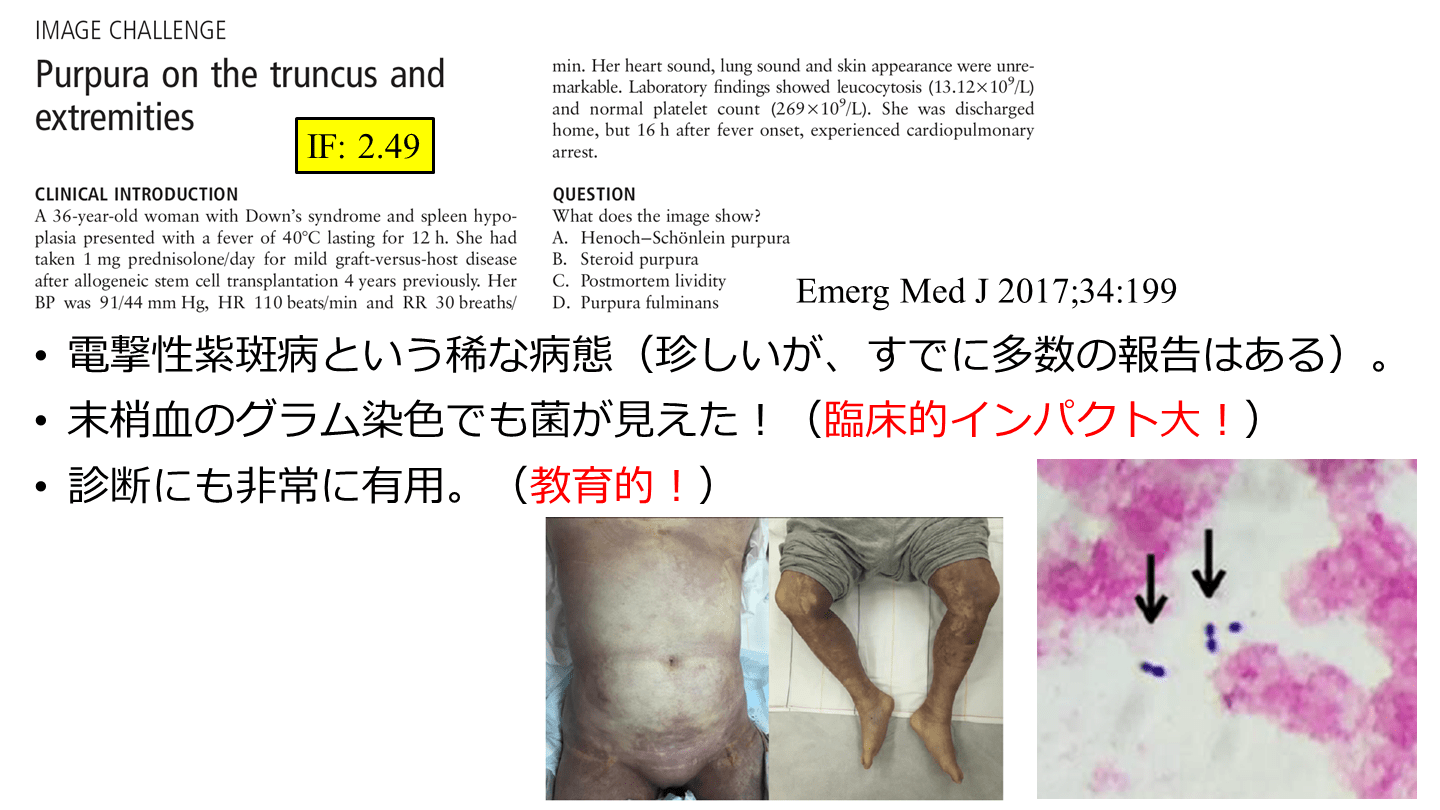 診断にも非常に有用。(教育的!) Emerg Med J 2017;34:199 IF: 2.49