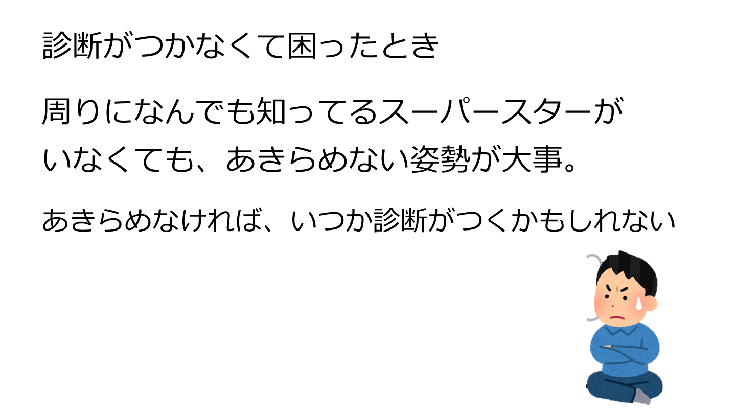 #22. 周りになんでも知ってるスーパースターがいなくても、あきらめない姿勢が大事。 あきらめなければ、いつか診断がつくかもしれない 診断がつかなくて困ったとき