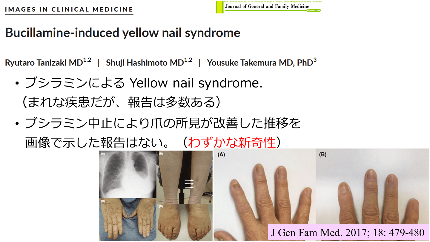 (まれな疾患だが、報告は多数ある) ブシラミン中止により爪の所見が改善した推移を画像で示した報告はない。(わずかな新奇性) J Gen Fam Med. 2017; 18: 479-480