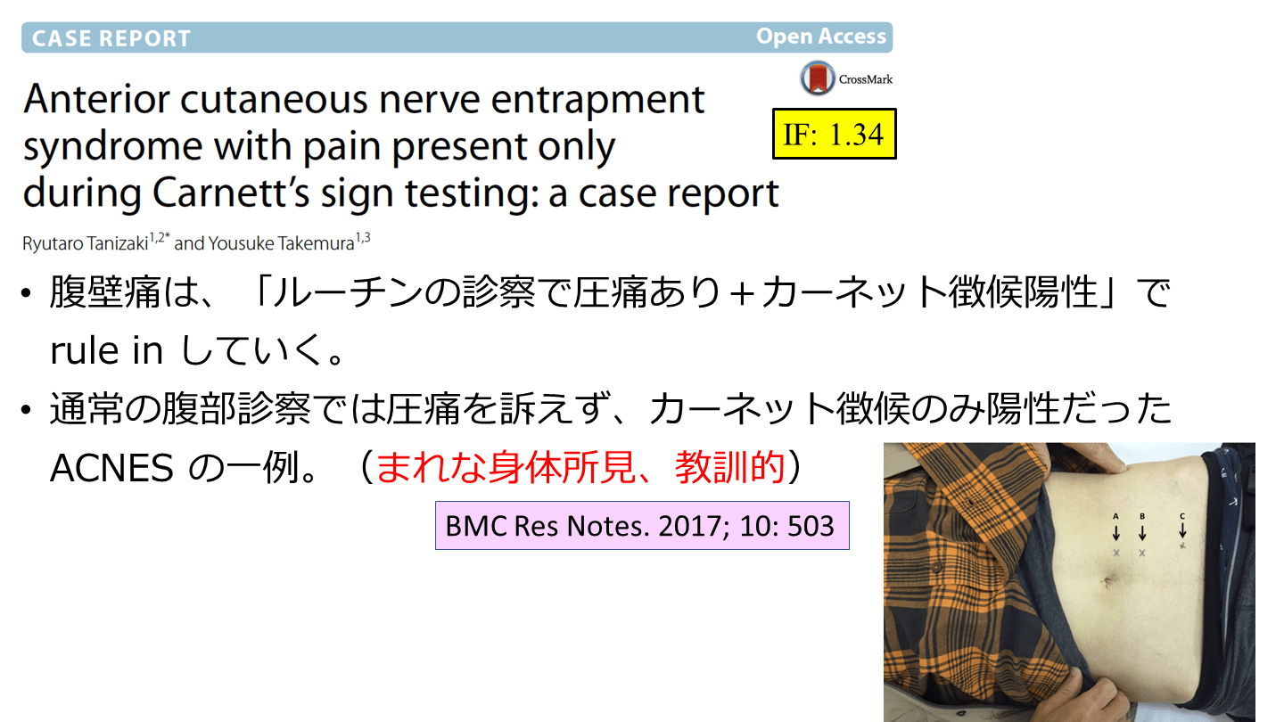 通常の腹部診察では圧痛を訴えず、カーネット徴候のみ陽性だった ACNES の一例。(まれな身体所見、教訓的) BMC Res Notes. 2017; 10: 503