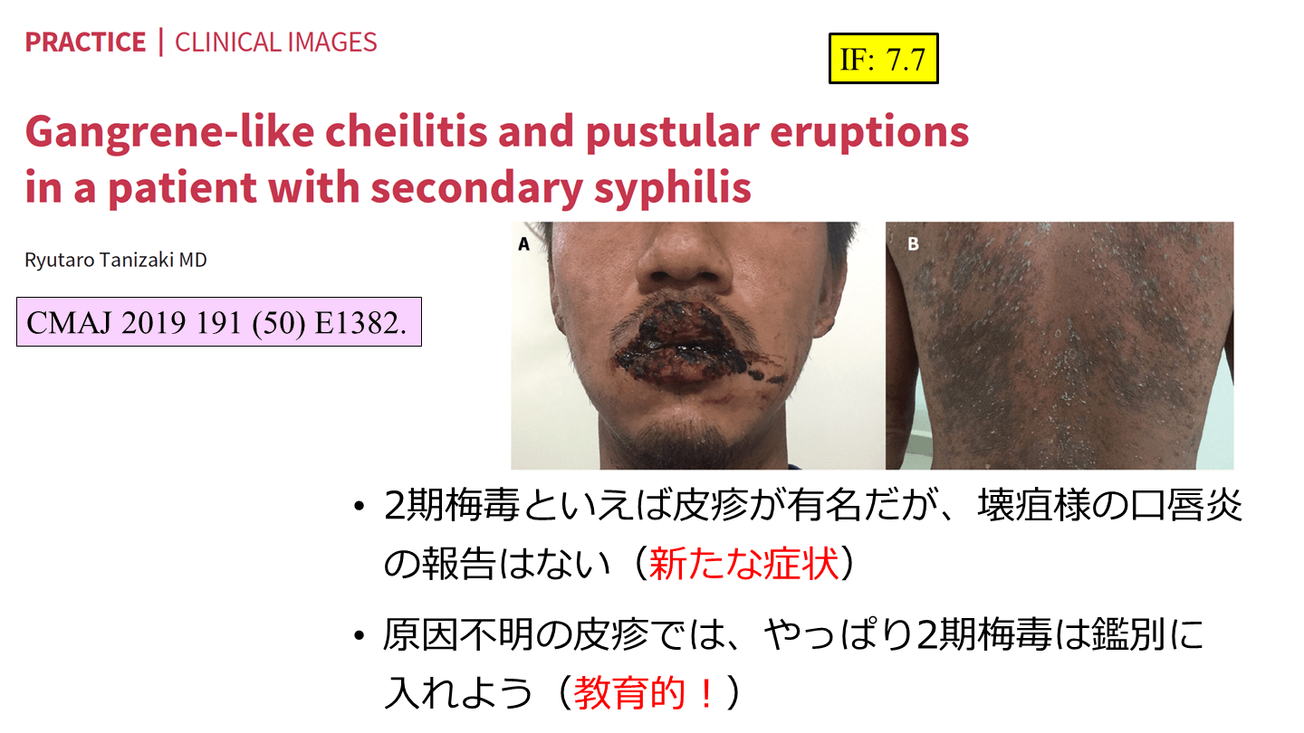 #26. 2期梅毒といえば皮疹が有名だが、壊疽様の口唇炎の報告はない(新たな症状) IF: 7.7 CMAJ 2019 191 (50) E1382. 原因不明の皮疹では、やっぱり2期梅毒は鑑別に入れよう(教育的!)