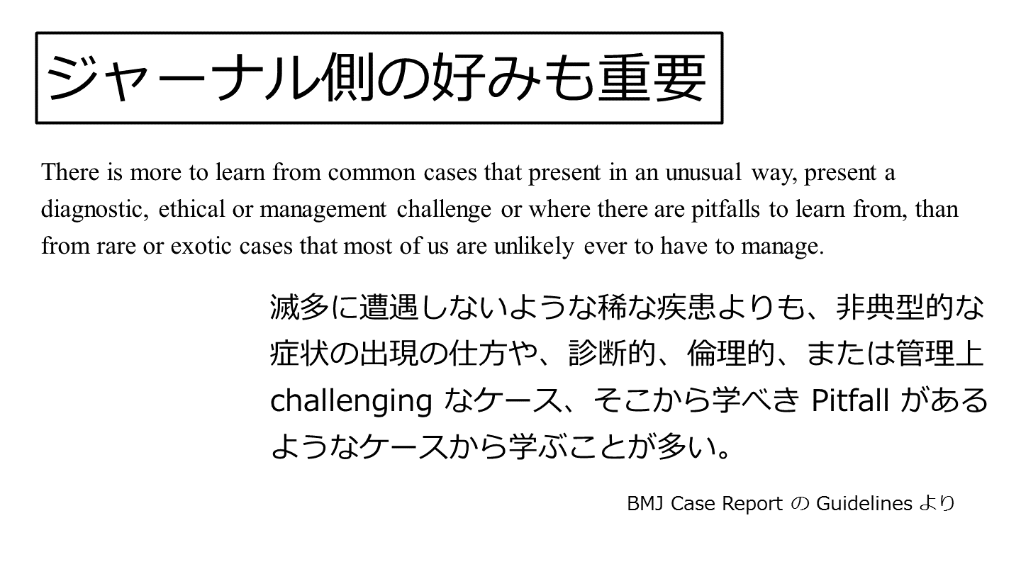 #28. BMJ Case Report の Guidelines より There is more to learn from common cases that present in an unusual way, present a diagnostic, ethical or management challenge or where there are pitfalls to learn from, than from rare or exotic cases that most of us are unlikely ever to have to manage. 滅多に遭遇しないような稀な疾患よりも、非典型的な症状の出現の仕方や、診断的、倫理的、または管理上 challenging なケース、そこから学べき Pitfall があるようなケースから学ぶことが多い。 ジャーナル側の好みも重要