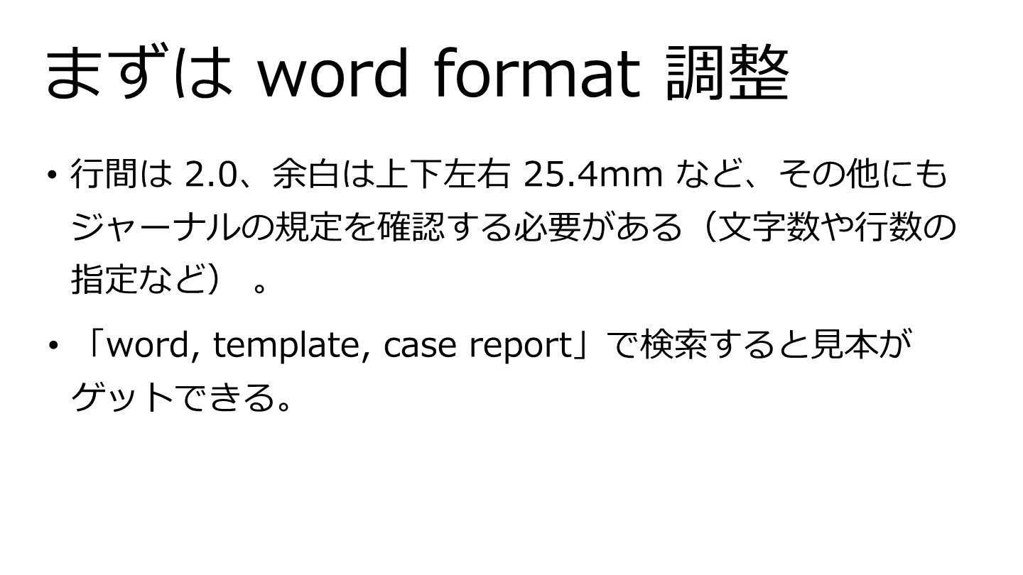 #30. まずは word format 調整 「word, template, case report」で検索すると見本がゲットできる。 行間は 2.0、余白は上下左右 25.4mm など、その他にもジャーナルの規定を確認する必要がある(文字数や行数の指定など) 。