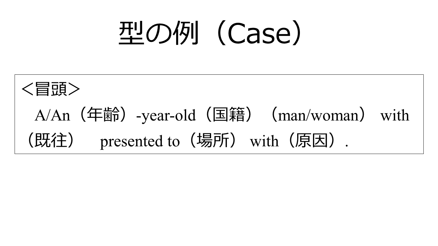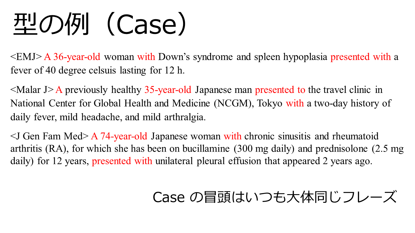 #35. 型の例(Case) <EMJ> A 36-year-old woman with Down’s syndrome and spleen hypoplasia presented with a fever of 40 degree celsuis lasting for 12 h. <Malar J> A previously healthy 35-year-old Japanese man presented to the travel clinic in National Center for Global Health and Medicine (NCGM), Tokyo with a two-day history of daily fever, mild headache, and mild arthralgia. <J Gen Fam Med> A 74-year-old Japanese woman with chronic sinusitis and rheumatoid arthritis (RA), for which she has been on bucillamine (300 mg daily) and prednisolone (2.5 mg daily) for 12 years, presented with unilateral pleural effusion that appeared 2 years ago. Case の冒頭はいつも大体同じフレーズ