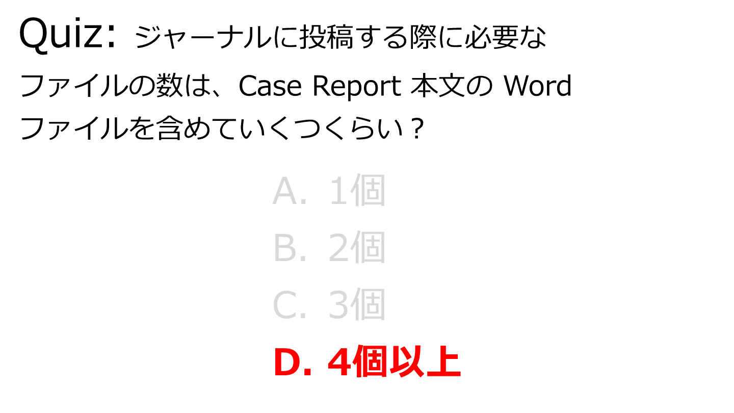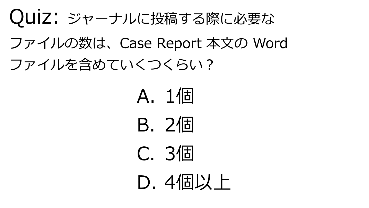 #37. Quiz: ジャーナルに投稿する際に必要なファイルの数は、Case Report 本文の Word ファイルを含めていくつくらい? 1個