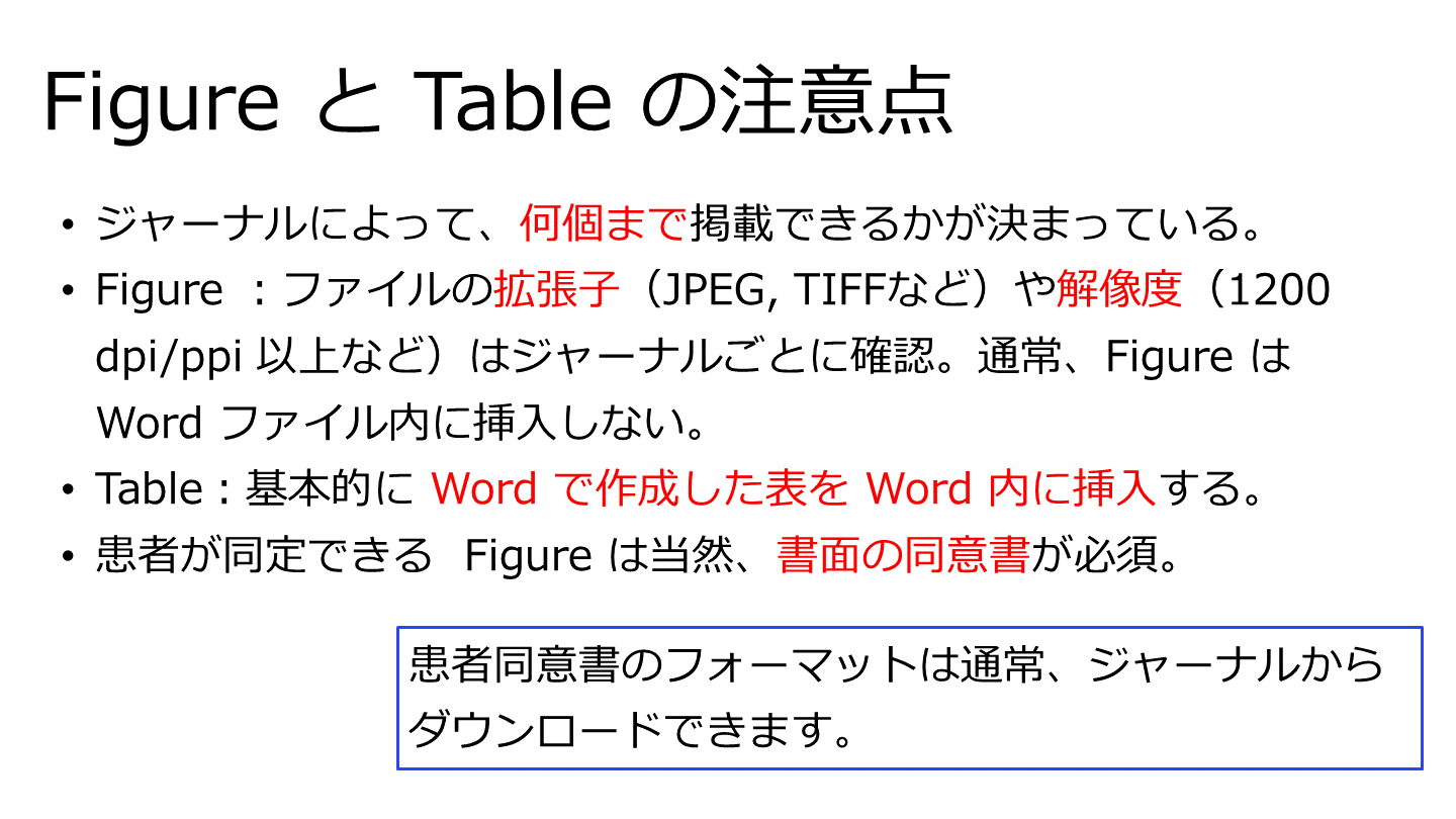 患者が同定できる Figure は当然、書面の同意書が必須。 患者同意書のフォーマットは通常、ジャーナルからダウンロードできます。