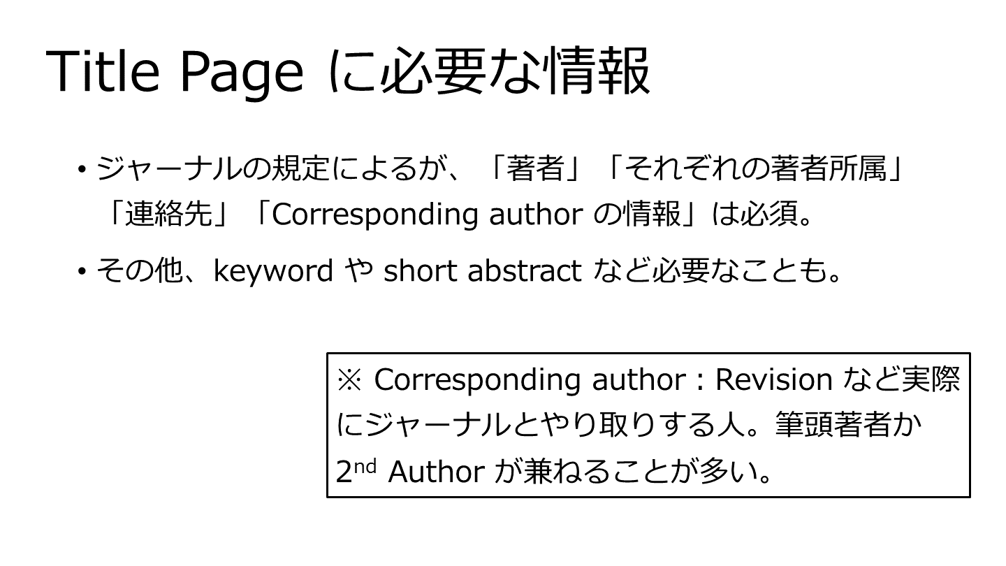 その他、keyword や short abstract など必要なことも。 ※ Corresponding author:Revision など実際にジャーナルとやり取りする人。筆頭著者か 2nd Author が兼ねることが多い。