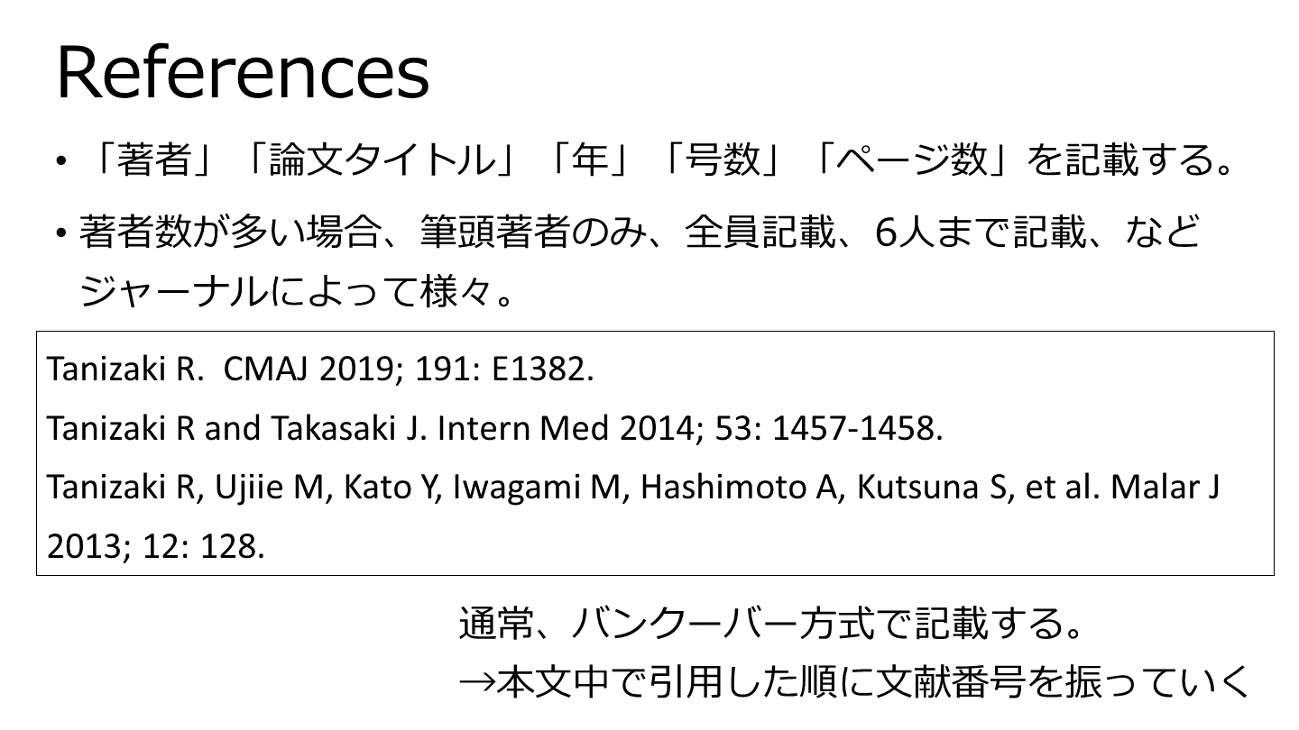 Tanizaki R, Ujiie M, Kato Y, Iwagami M, Hashimoto A, Kutsuna S, et al. Malar J 2013; 12: 128. 通常、バンクーバー方式で記載する。