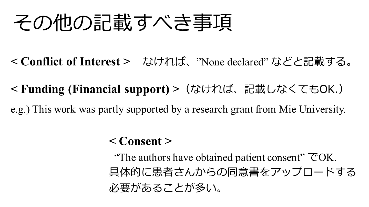具体的に患者さんからの同意書をアップロードする必要があることが多い。 < Funding (Financial support) >(なければ、記載しなくてもOK.)