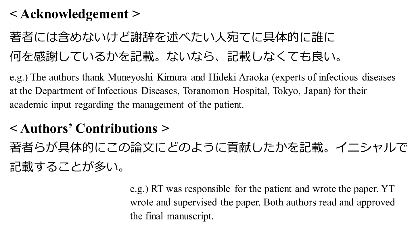 著者らが具体的にこの論文にどのように貢献したかを記載。イニシャルで記載することが多い。 e.g.) The authors thank Muneyoshi Kimura and Hideki Araoka (experts of infectious diseases at the Department of Infectious Diseases, Toranomon Hospital, Tokyo, Japan) for their academic input regarding the management of the patient. e.g.) RT was responsible for the patient and wrote the paper. YT wrote and supervised the paper. Both authors read and approved the final manuscript.
