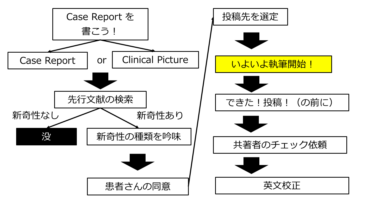 書こう! Case Report Clinical Picture 先行文献の検索 没 新奇性の種類を吟味 新奇性なし 新奇性あり or 患者さんの同意 投稿先を選定 いよいよ執筆開始! できた!投稿!(の前に) 共著者のチェック依頼 英文校正