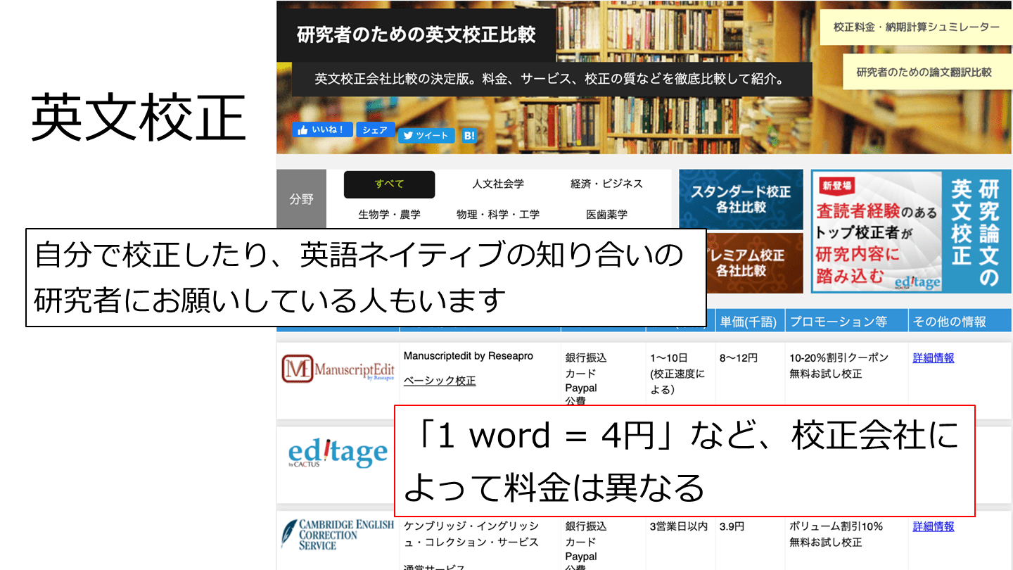 #45. 英文校正 「1 word = 4円」など、校正会社によって料金は異なる 自分で校正したり、英語ネイティブの知り合いの研究者にお願いしている人もいます