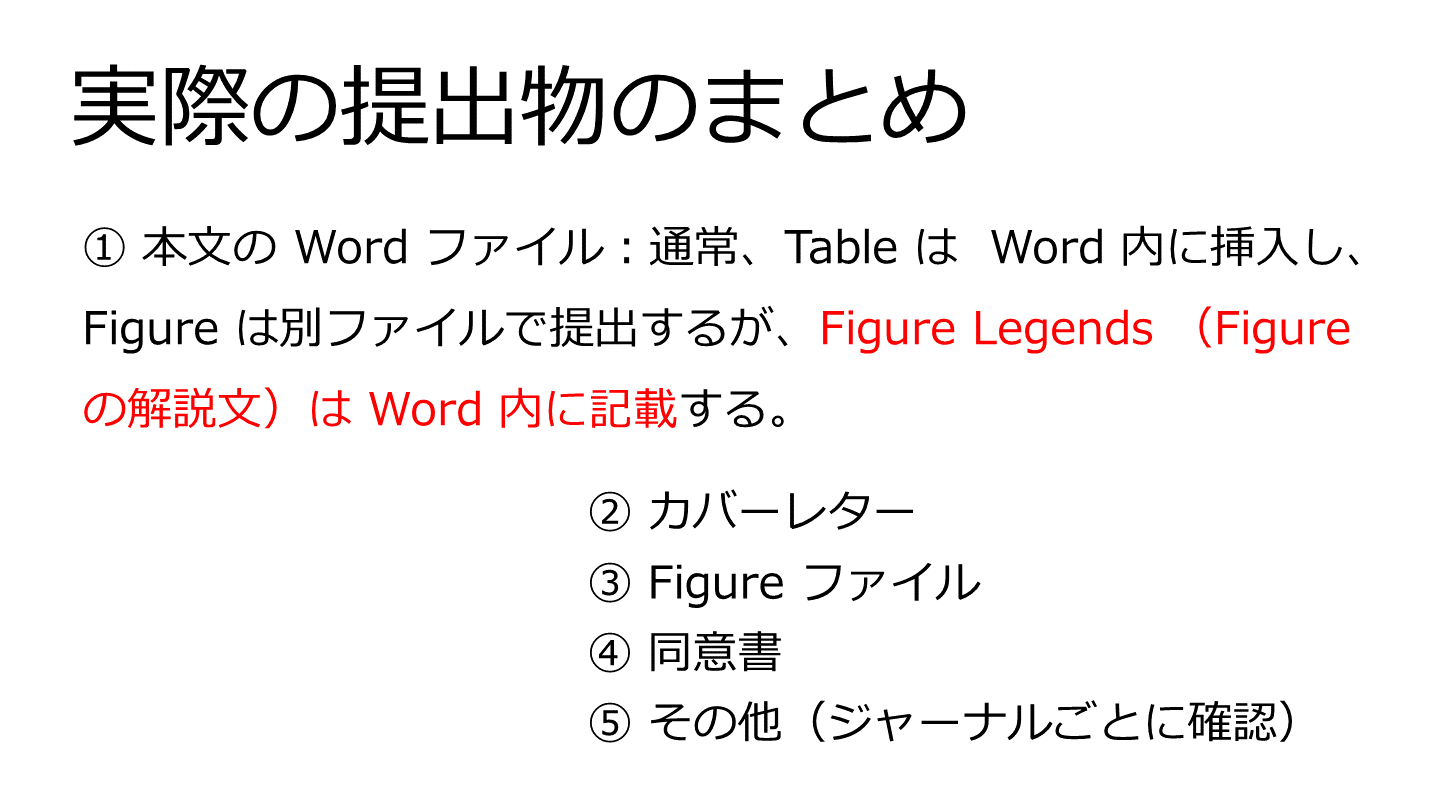 #47. 実際の提出物のまとめ ① 本文の Word ファイル:通常、Table は Word 内に挿入し、Figure は別ファイルで提出するが、Figure Legends (Figure の解説文)は Word 内に記載する。 ② カバーレター