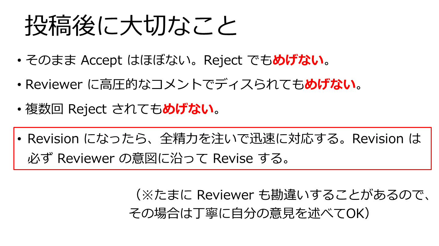 複数回 Reject されてもめげない。 Revision になったら、全精力を注いで迅速に対応する。Revision は必ず Reviewer の意図に沿って Revise する。 (※たまに Reviewer も勘違いすることがあるので、その場合は丁寧に自分の意見を述べてOK)