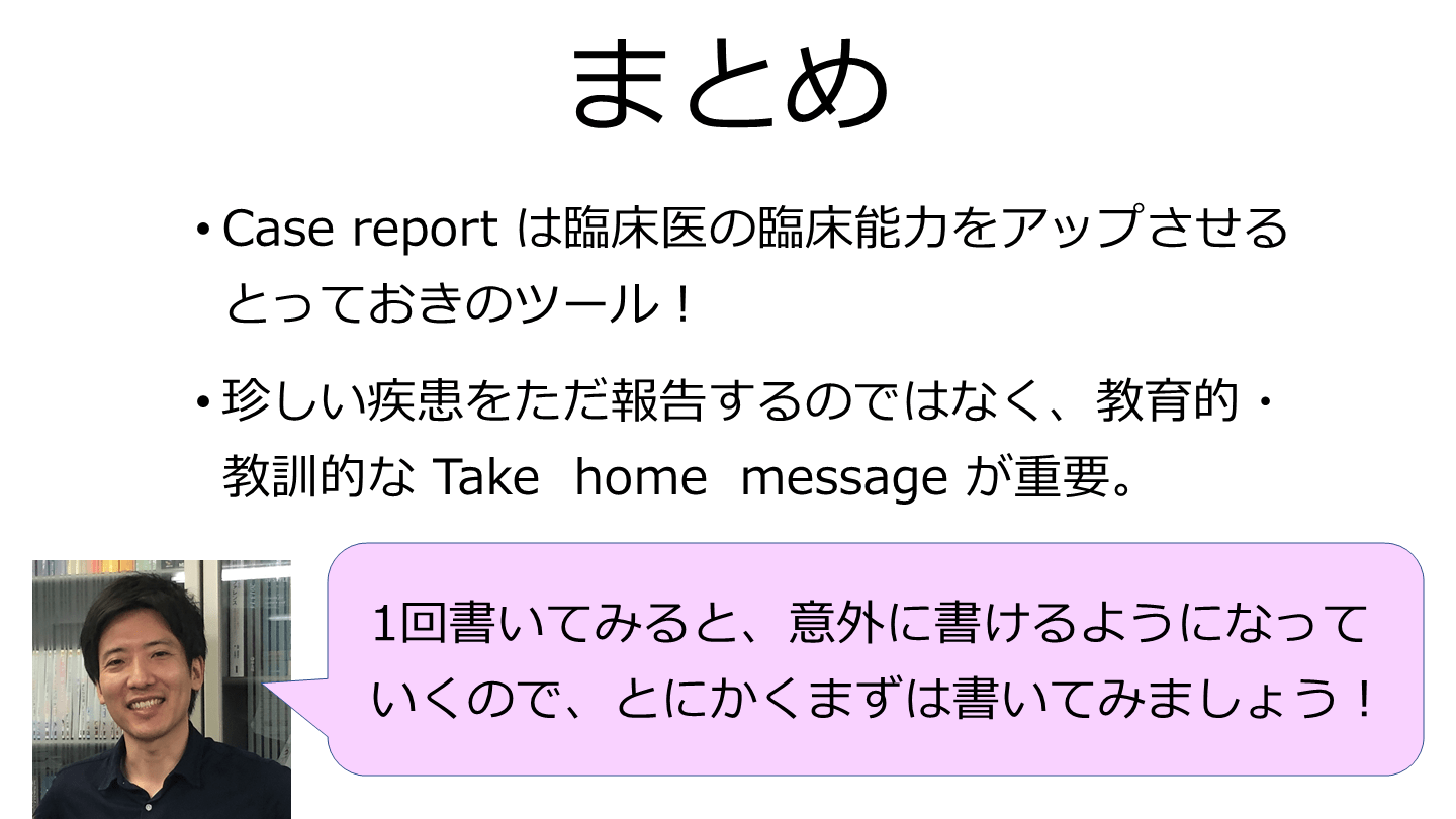 #60. まとめ Case report は臨床医の臨床能力をアップさせるとっておきのツール! 珍しい疾患をただ報告するのではなく、教育的・教訓的な Take home message が重要。 1回書いてみると、意外に書けるようになっていくので、とにかくまずは書いてみましょう!
