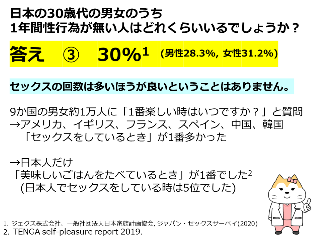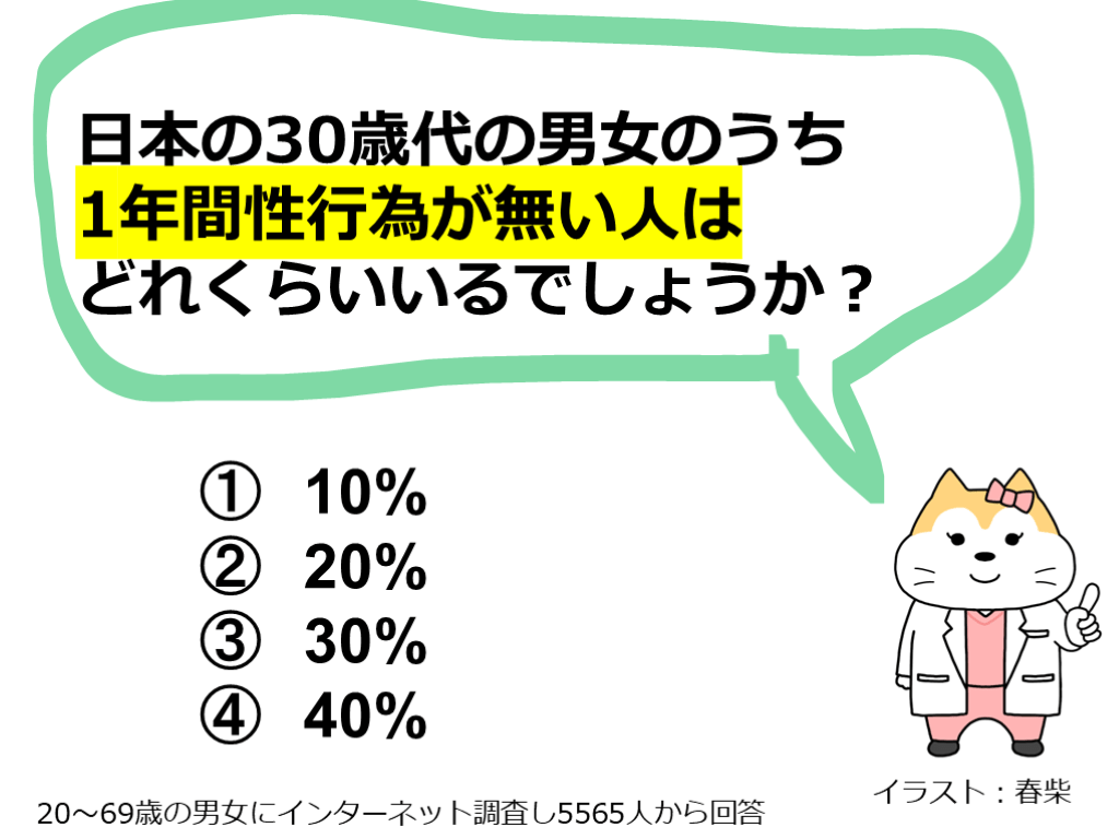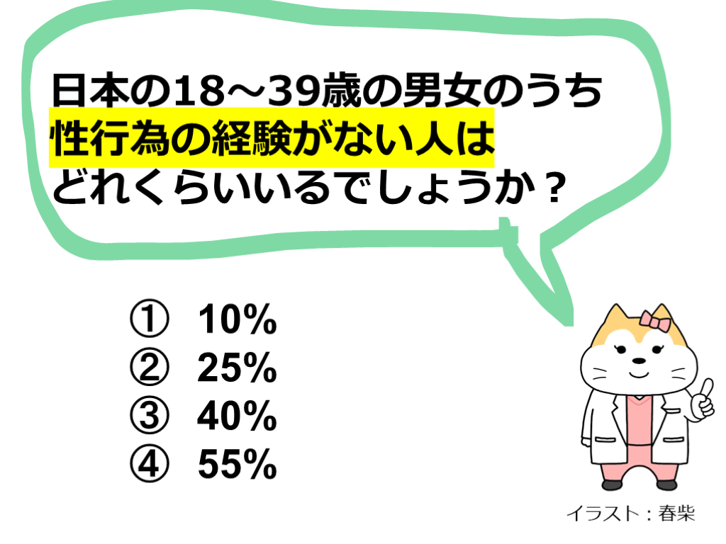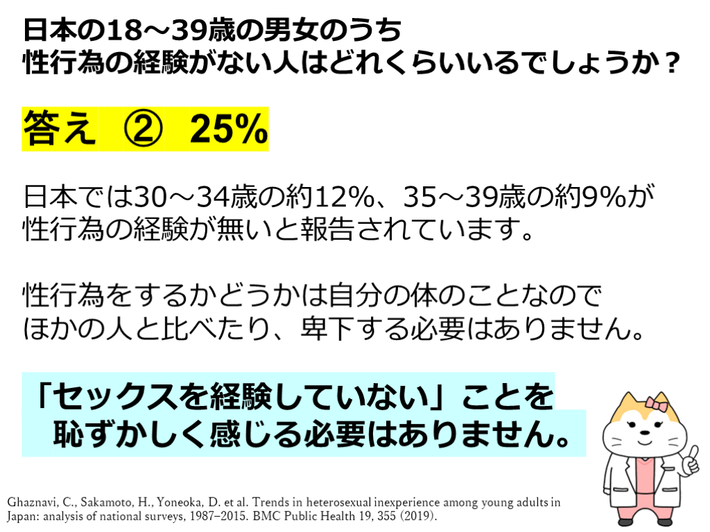 答え ② 25% Ghaznavi, C., Sakamoto, H., Yoneoka, D. et al. Trends in heterosexual inexperience among young adults in Japan: analysis of national surveys, 1987–2015. BMC Public Health 19, 355 (2019). 日本では30~34歳の約12%、35~39歳の約9%が性行為の経験が無いと報告されています。