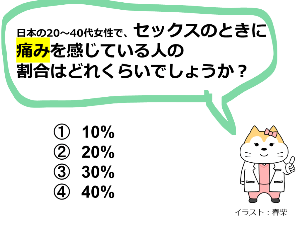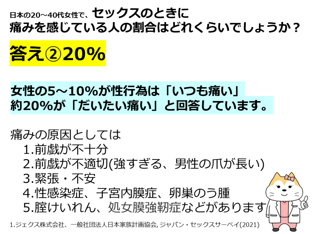 痛みを感じている人の割合はどれくらいでしょうか? 答え②20% 1.ジェクス株式会社、一般社団法人日本家族計画協会, ジャパン・セックスサーベイ(2021)