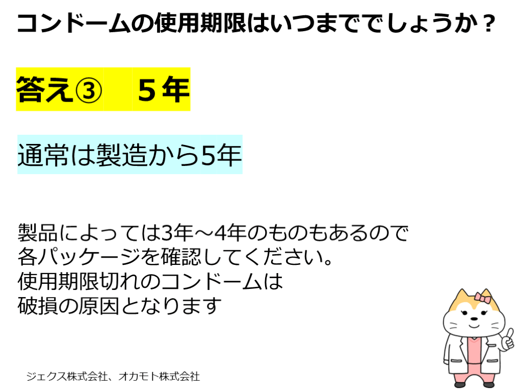 #11. コンドームの使用期限はいつまででしょうか? 答え③ 5年 ジェクス株式会社、オカモト株式会社