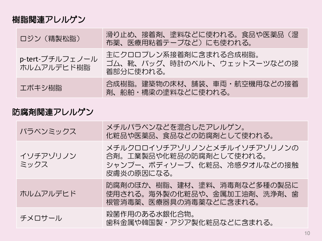 #10. 樹脂関連アレルゲン ロジン(精製松脂) 滑り止め、接着剤、塗料などに使われる。食品や医薬品(湿 布薬、医療用粘着テープなど)にも使われる。 p-tert-ブチルフェノール ホルムアルデヒド樹脂 主にクロロプレン系接着剤に含まれる合成樹脂。 ゴム、靴、バッグ、時計のベルト、ウェットスーツなどの接 着部分に使われる。 エポキシ樹脂 合成樹脂。建築物の床材、舗装、車両・航空機用などの接着 剤、船舶・橋梁の塗料などに使われる。 防腐剤関連アレルゲン パラベンミックス メチルパラベンなどを混合したアレルゲン。 化粧品や医薬品、食品などの防腐剤として使われる。 イソチアゾリノン ミックス メチルクロロイソチアゾリノンとメチルイソチアゾリノンの 合剤。工業製品や化粧品の防腐剤として使われる。 シャンプー、ボディソープ、化粧品、冷感タオルなどの接触 皮膚炎の原因になる。 ホルムアルデヒド 防腐剤のほか、樹脂、建材、塗料、消毒剤など多種の製品に 使用される。海外製の化粧品や、金属加工油剤、洗浄剤、歯 根管消毒薬、医療器具の消毒薬などに含まれる。 チメロサール 殺菌作用のある水銀化合物。 歯科金属や韓国製・アジア製化粧品などに含まれる。 10