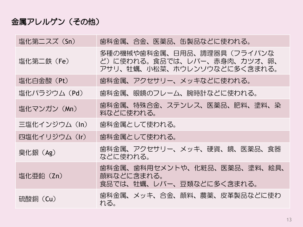 #13. 金属アレルゲン(その他) 塩化第二スズ(Sn) 歯科金属、合金、医薬品、缶製品などに使われる。 塩化第二鉄(Fe) 多種の機械や歯科金属、日用品、調理器具(フライパンな ど)に使われる。食品では、レバー、赤身肉、カツオ、卵、 アサリ、牡蠣、小松菜、ホウレンソウなどに多く含まれる。 塩化白金酸(Pt) 歯科金属、アクセサリー、メッキなどに使われる。 塩化パラジウム(Pd) 歯科金属、眼鏡のフレーム、腕時計などに使われる。 塩化マンガン(Mn) 歯科金属、特殊合金、ステンレス、医薬品、肥料、塗料、染 料などに使われる。 三塩化インジウム(In) 歯科金属として使われる。 四塩化イリジウム(Ir) 歯科金属として使われる。 臭化銀(Ag) 歯科金属、アクセサリー、メッキ、硬貨、鏡、医薬品、食器 などに使われる。 塩化亜鉛(Zn) 歯科金属、歯科用セメントや、化粧品、医薬品、塗料、絵具、 顔料などに含まれる。 食品では、牡蠣、レバー、豆類などに多く含まれる。 硫酸銅(Cu) 歯科金属、メッキ、合金、顔料、農薬、皮革製品などに使わ れる。 13