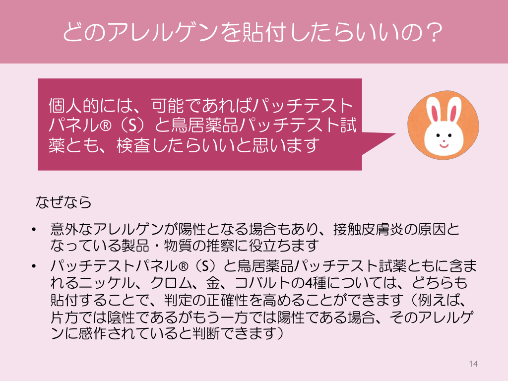 #14. どのアレルゲンを貼付したらいいの? 個人的には、可能であればパッチテスト パネル®(S)と鳥居薬品パッチテスト試 薬とも、検査したらいいと思います なぜなら • 意外なアレルゲンが陽性となる場合もあり、接触皮膚炎の原因と なっている製品・物質の推察に役立ちます • パッチテストパネル®(S)と鳥居薬品パッチテスト試薬ともに含ま れるニッケル、クロム、金、コバルトの4種については、どちらも 貼付することで、判定の正確性を高めることができます(例えば、 片方では陰性であるがもう一方では陽性である場合、そのアレルゲ ンに感作されていると判断できます) 14