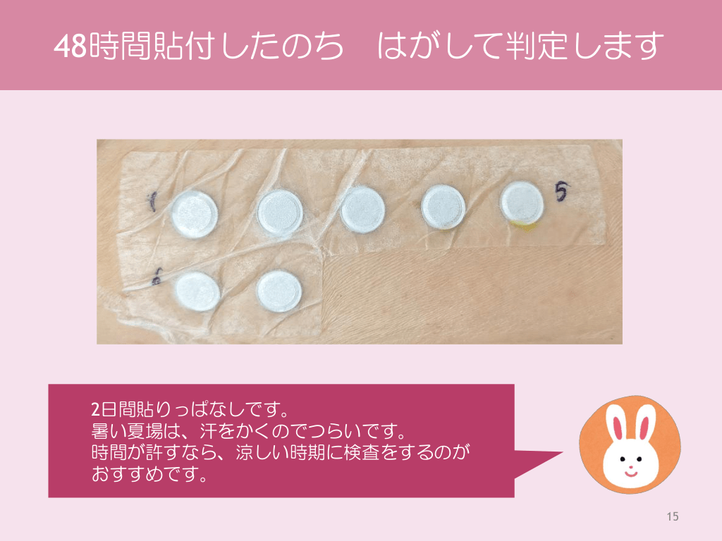 #15. 48時間貼付したのち はがして判定します 2日間貼りっぱなしです。 暑い夏場は、汗をかくのでつらいです。 時間が許すなら、涼しい時期に検査をするのが おすすめです。 15