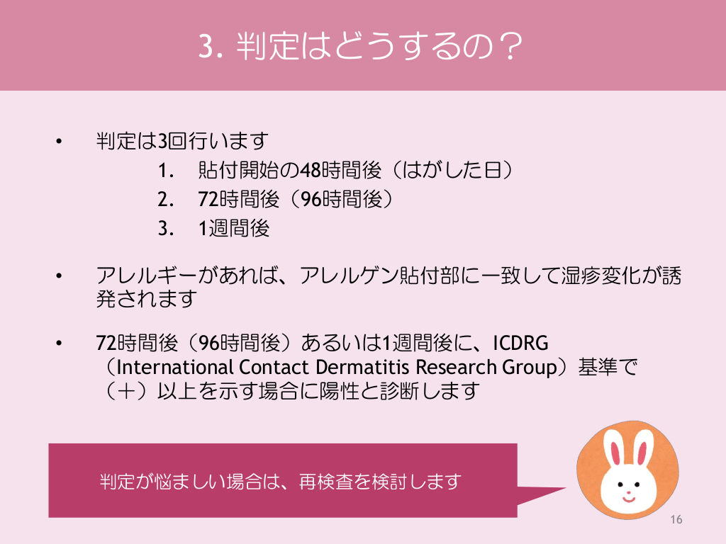 #16. 3. 判定はどうするの? • 判定は3回行います 1. 貼付開始の48時間後(はがした日) 2. 72時間後(96時間後) 3. 1週間後 • アレルギーがあれば、アレルゲン貼付部に一致して湿疹変化が誘 発されます • 72時間後(96時間後)あるいは1週間後に、ICDRG (International Contact Dermatitis Research Group)基準で (+)以上を示す場合に陽性と診断します 判定が悩ましい場合は、再検査を検討します 16