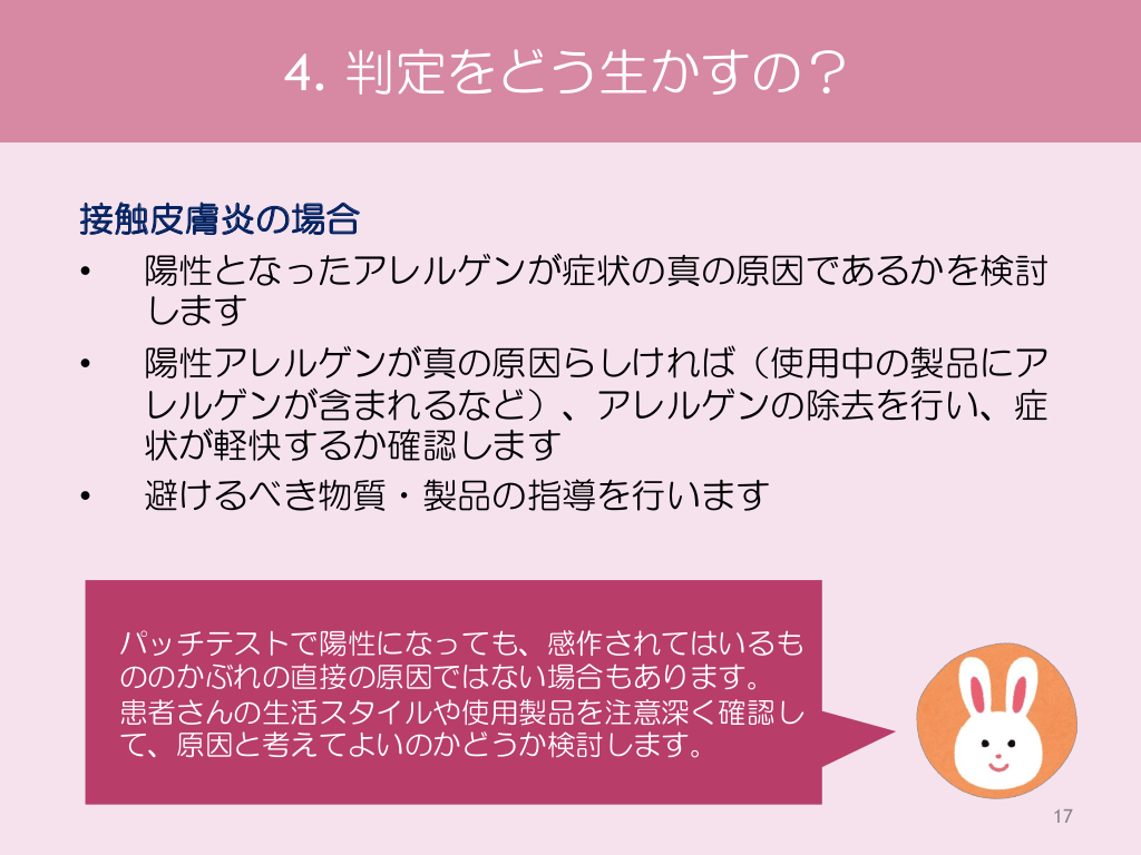 #17. 4. 判定をどう生かすの? 接触皮膚炎の場合 • 陽性となったアレルゲンが症状の真の原因であるかを検討 します • 陽性アレルゲンが真の原因らしければ(使用中の製品にア レルゲンが含まれるなど)、アレルゲンの除去を行い、症 状が軽快するか確認します • 避けるべき物質・製品の指導を行います パッチテストで陽性になっても、感作されてはいるも ののかぶれの直接の原因ではない場合もあります。 患者さんの生活スタイルや使用製品を注意深く確認し て、原因と考えてよいのかどうか検討します。 17