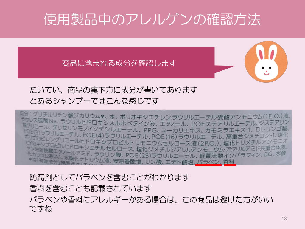 #18. 使用製品中のアレルゲンの確認方法 商品に含まれる成分を確認します たいてい、商品の裏下方に成分が書いてあります とあるシャンプーではこんな感じです 防腐剤としてパラベンを含むことがわかります 香料を含むことも記載されています パラベンや香料にアレルギーがある場合は、この商品は避けた方がいい ですね 18