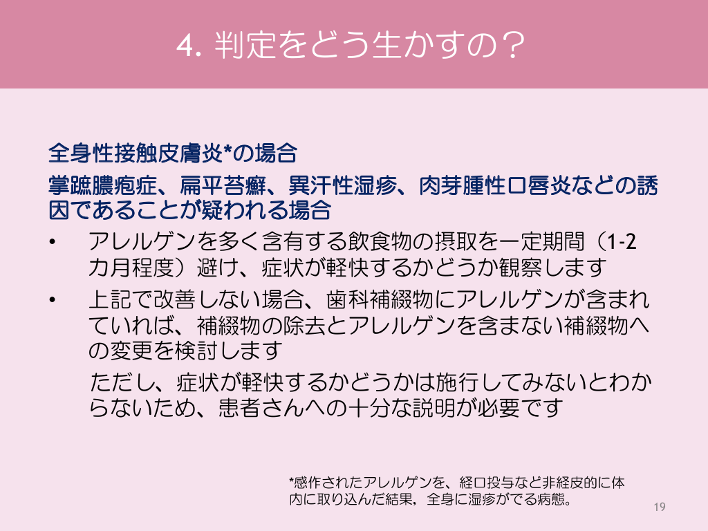 #19. 4. 判定をどう生かすの? 全身性接触皮膚炎*の場合 掌蹠膿疱症、扁平苔癬、異汗性湿疹、肉芽腫性口唇炎などの誘 因であることが疑われる場合 • アレルゲンを多く含有する飲食物の摂取を一定期間(1-2 カ月程度)避け、症状が軽快するかどうか観察します • 上記で改善しない場合、歯科補綴物にアレルゲンが含まれ ていれば、補綴物の除去とアレルゲンを含まない補綴物へ の変更を検討します ただし、症状が軽快するかどうかは施行してみないとわか らないため、患者さんへの十分な説明が必要です *感作されたアレルゲンを、経口投与など非経皮的に体 内に取り込んだ結果,全身に湿疹がでる病態。 19