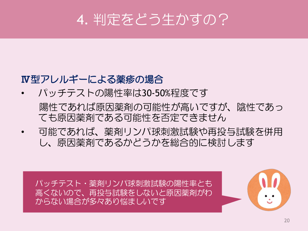 #20. 4. 判定をどう生かすの? Ⅳ型アレルギーによる薬疹の場合 • パッチテストの陽性率は30-50%程度です 陽性であれば原因薬剤の可能性が高いですが、陰性であっ ても原因薬剤である可能性を否定できません • 可能であれば、薬剤リンパ球刺激試験や再投与試験を併用 し、原因薬剤であるかどうかを総合的に検討します パッチテスト・薬剤リンパ球刺激試験の陽性率とも 高くないので、再投与試験をしないと原因薬剤がわ からない場合が多々あり悩ましいです 20