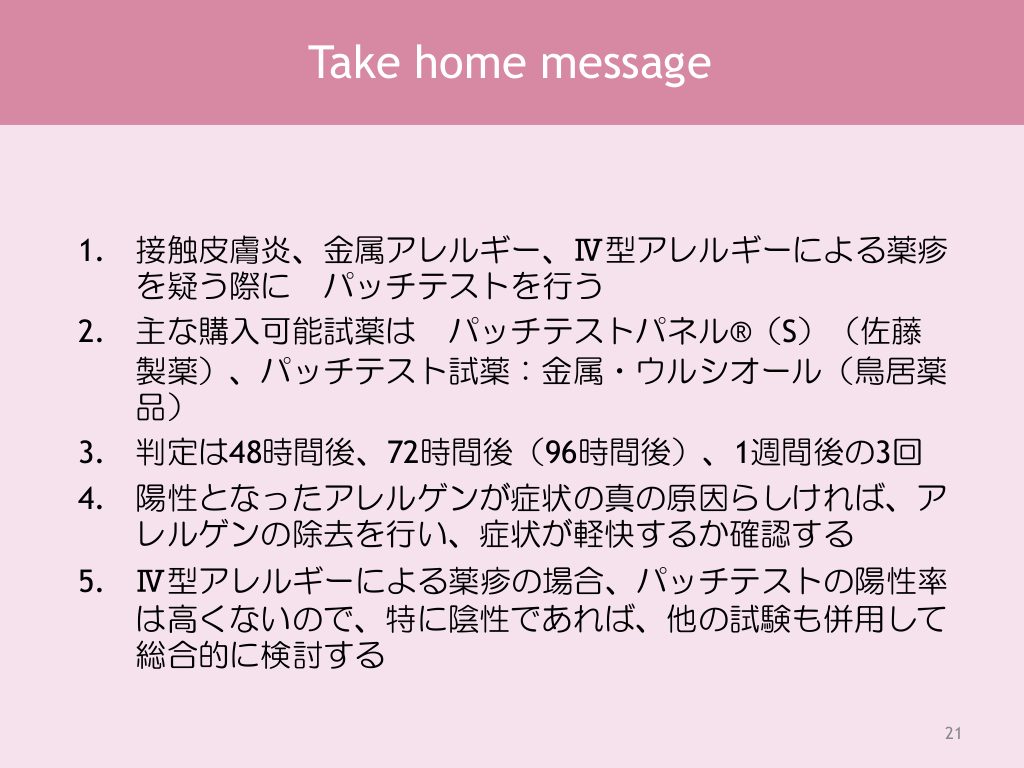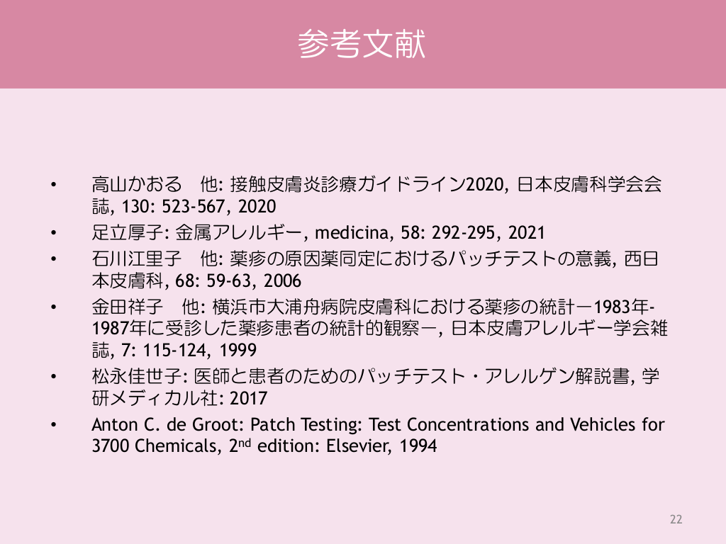 #21. Take home message 1. 接触皮膚炎、金属アレルギー、Ⅳ型アレルギーによる薬疹 を疑う際に パッチテストを行う 2. 主な購入可能試薬は パッチテストパネル®(S)(佐藤 製薬)、パッチテスト試薬:金属・ウルシオール(鳥居薬 品) 3. 判定は48時間後、72時間後(96時間後)、1週間後の3回 4. 陽性となったアレルゲンが症状の真の原因らしければ、ア レルゲンの除去を行い、症状が軽快するか確認する 5. Ⅳ型アレルギーによる薬疹の場合、パッチテストの陽性率 は高くないので、特に陰性であれば、他の試験も併用して 総合的に検討する 21