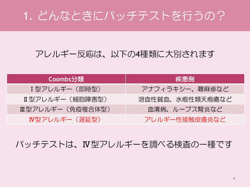 #4. 1. どんなときにパッチテストを行うの? アレルギー反応は、以下の4種類に大別されます Coombs分類 疾患例 Ⅰ型アレルギー(即時型) アナフィラキシー、蕁麻疹など Ⅱ型アレルギー(細胞障害型) 溶血性貧血、水疱性類天疱瘡など Ⅲ型アレルギー(免疫複合体型) 血清病、ループス腎炎など Ⅳ型アレルギー(遅延型) アレルギー性接触皮膚炎など パッチテストは、Ⅳ型アレルギーを調べる検査の一種です 4