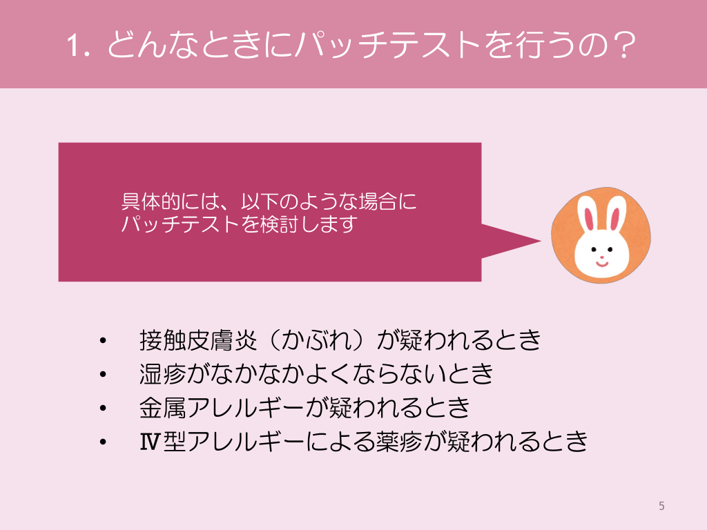 #5. 1. どんなときにパッチテストを行うの? 具体的には、以下のような場合に パッチテストを検討します • • • • 接触皮膚炎(かぶれ)が疑われるとき 湿疹がなかなかよくならないとき 金属アレルギーが疑われるとき Ⅳ型アレルギーによる薬疹が疑われるとき 5